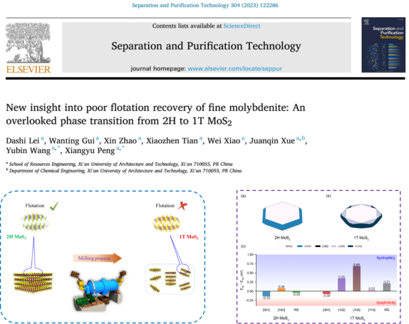 细粒级辉钼矿(MoS2)的浮选回收率较低,造成了严重的资源浪费及经济损失。基于以上问题,研究采用先进材料表征技术,发现细粒级辉钼矿在磨矿过程由于层间滑移作用诱导相变行为(稳定的2H相→活泼的1T相),并通过数值模拟分析验证了相变行为与浮选回收率降低的线性相关性;同时采用量子化学计算结合Wulff构型模拟,发现1T相MoS2能够暴露更多高折射率晶面,表现出更强的亲水性,不利于浮选回收。本研究有助于在原子层面深入了解细粒级辉钼矿的浮选行为,并有望为辉钼矿的高效浮选回收提供理论基础。