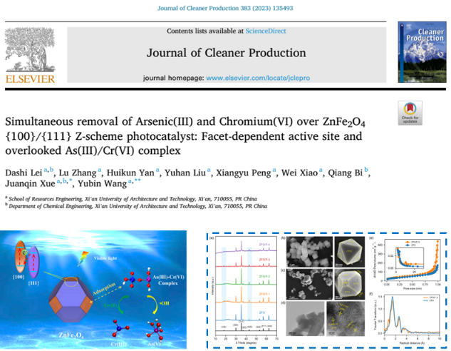 矿山废水中砷/铬金属离子的致癌率较高,但难以实现深度去除。研究通过调控晶面暴露行为,设计并制备了具有较强催化活性的Z型晶面光催化剂(ZnFe2O4 {}/{111}),实现了砷/铬有效去除。扩展X射线吸收精细结构(EXAFS)分析和密度泛函理论(DFT)计算表明,{}
