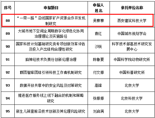 近日,中国科协发布了2023年度“科技智库青年人才计划”评审结果,经组织专家形式审查和综合评审,共评选出立项项目120项,我院吴赛赛副教授申报的项目“‘一带一路’沿线国家矿产资源合作开发机制研究”批准立项。
