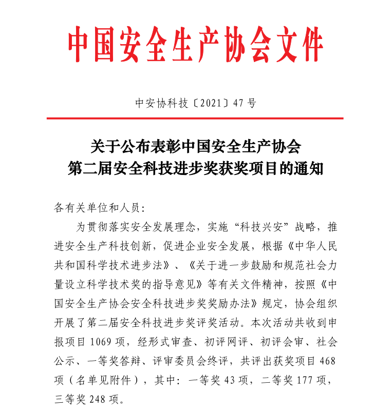 中国安全生产协会安全科技进步奖,是经国家科学技术奖励办公室批准设立,由中国安全生产协会组织开展安全科技进步奖相关评审工作。奖项覆盖我国安全生产领域,奖励在基础理论和管理方法研究、技术标准制定、科技技术发明、科技成果研发和转化、设施设备技术改造和创新等工作中做出突出贡献的有关单位和个人,每年评选一次,在安全学科领域具有重要的影响力。
