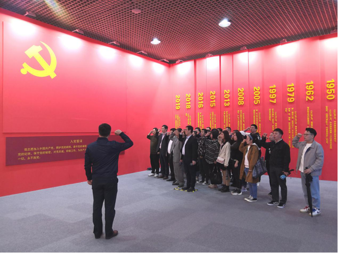 在会展中心,学院党委副书记刘冠同志带领全体师生党员,面对党旗党徽,再次庄严宣誓。铿锵恢宏的誓词,强烈震撼着在场的每一位党员,一字一句,神圣而豪迈,体现了党员同志们对中国共产党的无限忠诚。