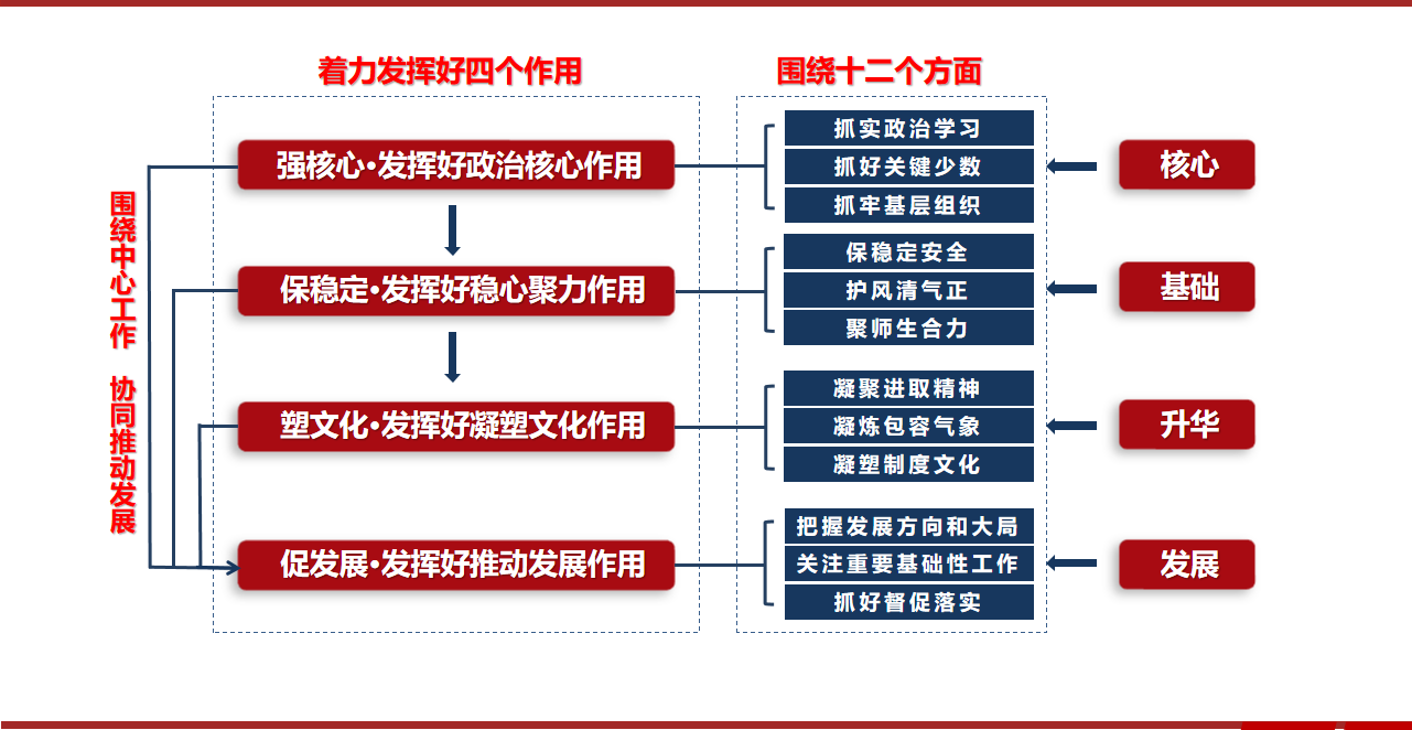党委聚焦主责主业,坚持“跳出党建看党建、围绕发展抓党建”的工作理念,以政治核心、稳心聚力、凝塑文化、推动发展等“四个作用发挥”作为党委工作出发点和落脚点,强核心、保稳定、塑文化、促发展,构建了十二个方面,包含三十三项具体任务的工作体系,团结带领全院师生开拓创新,埋头苦干,有力地推动了学院事业快速健康发展。