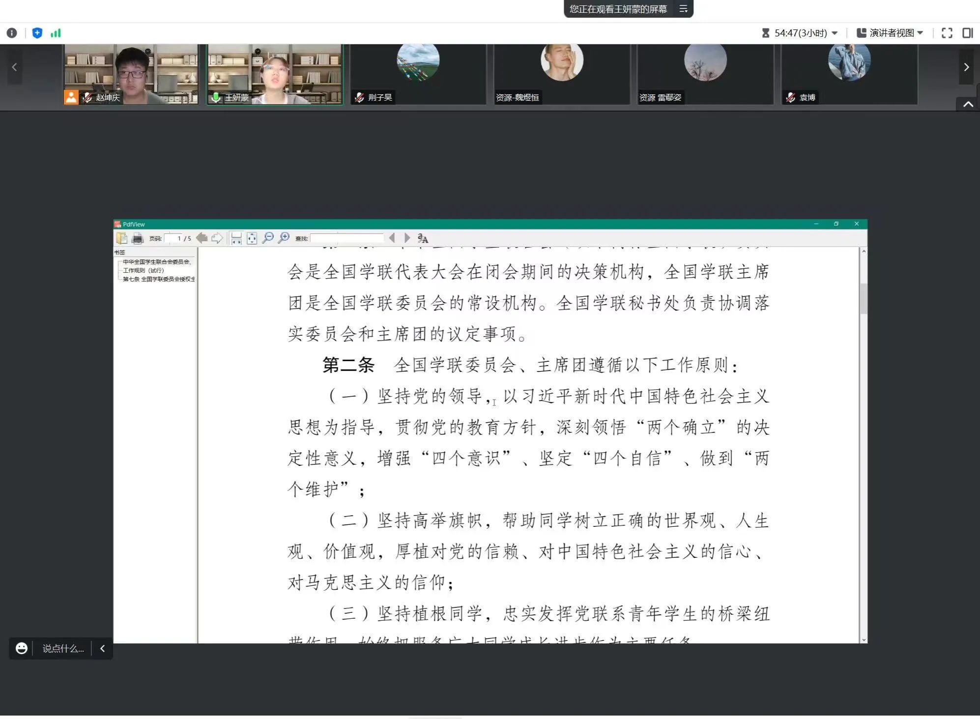 研究生会于腾讯会议线上开展“学习二十大、永远跟党走、奋进新征程”主题活动,研究生会全体成员参与,会议由研究生会执行主席赵坤庆主持。