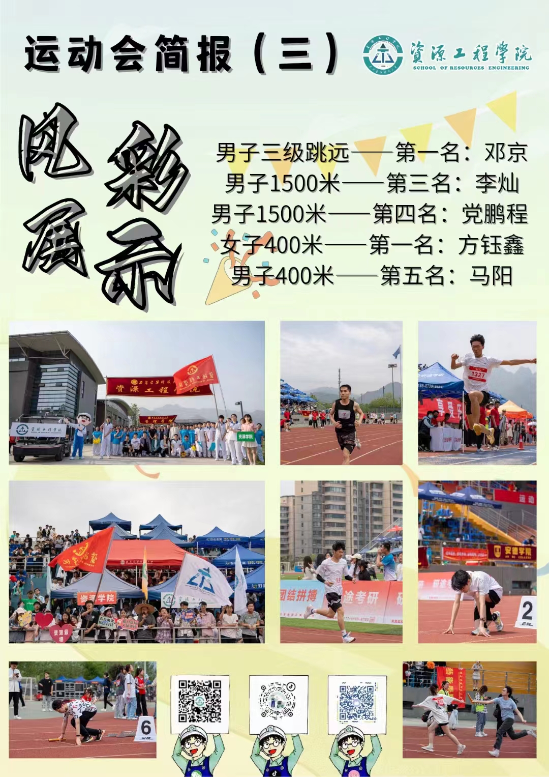 师生共参与了30个项目的角逐,激荡起体育强国的春潮!青春逢盛世,奋斗恰合宜,欢呼与呐喊交织,拼搏与汗水相碰,在全体师生的共同努力下,资源学院一举斩获了男子团体第八名、体育道德风尚奖。