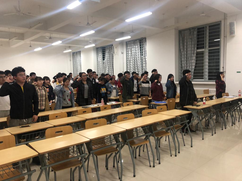 随后,安全工程1701班的熊光婷分享了她的四级经验。作为一个“过来人”,她将自己学习方法和备考方法讲给同学们,这对同学们的帮助无疑是非常大的。随后,由安全工程1802班的潘文龙带领同学们进行了四六级诚信宣誓。只见同学们气势昂扬 ,颇有几番沙场点兵的气魄。