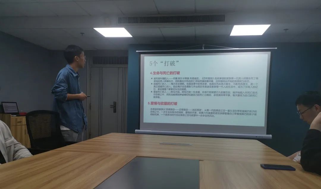 读书会上,贾开发首先对作者进行了简单介绍,接着从思想和艺术两个不同的维度,带领大家走进本次分享的书籍——《百年孤独》,这是一部永远不会被电影打败的小说,它打破万道屏障,仍是百年孤独。贾开发说道:“这或许是这部作品最打动我、最有魅力的地方,它与以往的小说有很大的不同,它冲破了一些作品相隔的壁垒,它是现实与幻想的打破、文学与历史的打破、故事与世界的打破、生命与死亡的打破、爱情与欲望的打破,这本书对很多元素进行了融合,它不能够被单一的归类,所以才能被作为经典一直流传。”