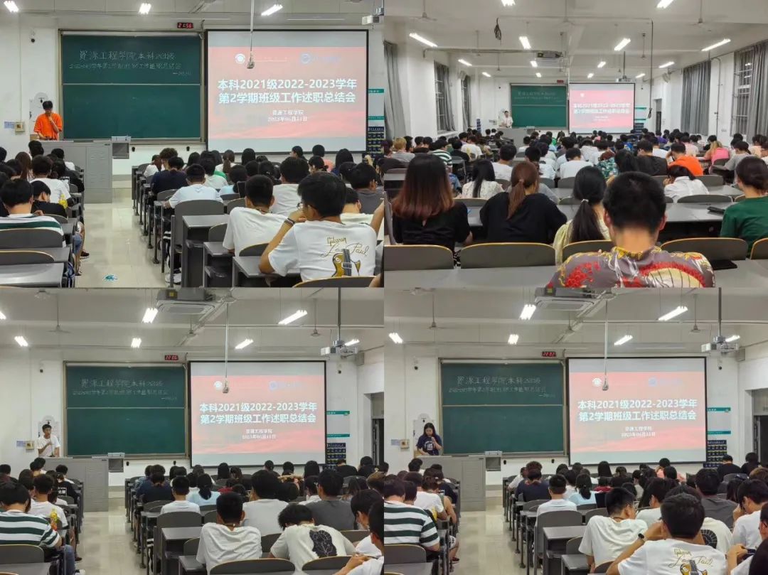 本科2021级于学府城9-406开展2022-2023学年第2学期班级工作述职总结会,会议由辅导员和郑翔主持,本科2021级全员参与。