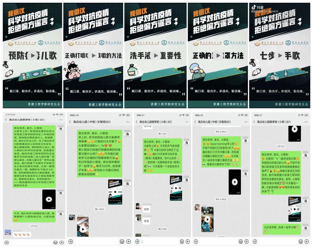 2020年4月6日--4月10日,资源志愿者们联系了西咸新区泾河新城第二幼儿园,各班级负责老师以网课等形式每天为小朋友播放视频,宣传科学的防疫知识,帮助小朋友们更好地认识新冠病毒,让儿童科学对抗疫情,拒绝偏方谣言。
