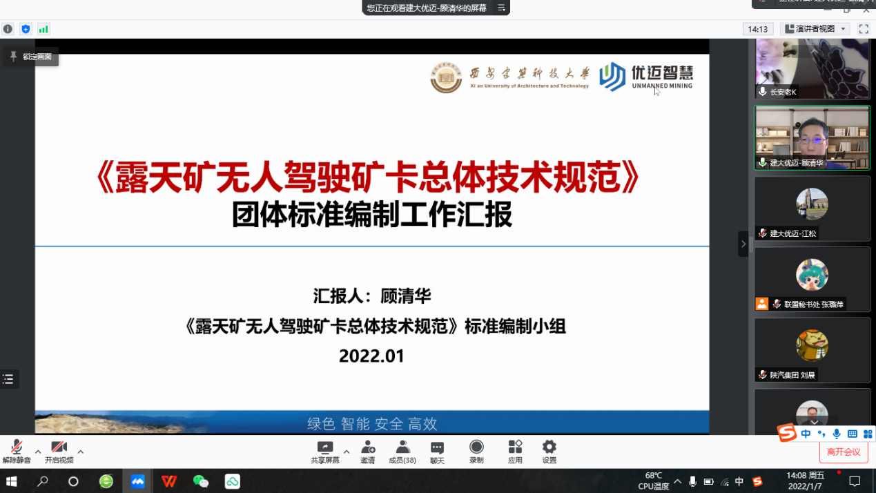 会上,西建大优迈智慧矿山研究院总经理翟文斌致欢迎词。陕西智能网联汽车研究院总经理张武做主旨发言,介绍了团体标准建设的重要意义。我校顾清华教授作为标准起草工作组代表汇报了标准编制情况及意见修改情况。顾清华教授从编制工作简况、主要内容详解、主要参考范围及依据、专家意见及修订情况四大板块进行讲解,阐述了《规范》中露天矿无人驾驶运输车辆的技术指标、硬件配置、环境感知及安全保障等方面的内容。