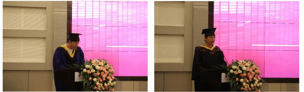 2019级研究生郭新桉和2018级本科生肖铭志作为毕业生代表发言。通过回忆在资源学院求学的点点滴滴,向资源学院的所有恩师们表达了感激之情,呼吁所有毕业生们,在青春最灿烂的地方绽放自己的光彩,为实现第二个百年奋斗目标而不懈努力。