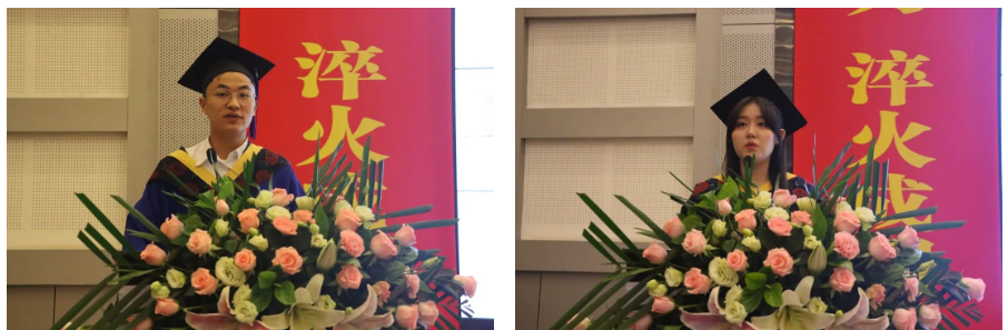 2020级研究生叶金秋、2019级本科生弥芯怡作为毕业生代表发言,回顾了自己的求学历程和在校园生活的青春时光,向兢兢业业的老师们表达了感激之情,对离别校园表达了不舍,也向全体毕业生发起青春奋斗的号召,在未来的奋斗路上,永葆建大本色,传承母校优良传统,将青春和热血奉献给祖国。