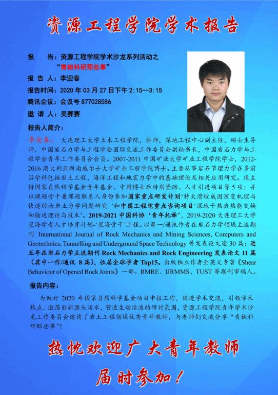 学院定于3月27日(本周五)下午2:15召开青年学术沙龙,会议邀请了大连理工大学岩土工程领域青年优秀教师李迎春,分享基金申请、论文写作、科研规划等内容的经验与体会。报告结束后学院老师可进行基金申报交流,相互促进,诚邀各位老师积极参加。