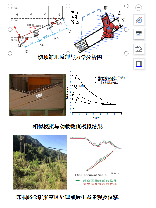 采空区处理和深部开采动力灾害防控是我国长期存在的采矿技术难题,处理不当深部会诱发生岩爆或大变形等地压灾害,浅部会诱发顶板冲击地压灾难,都会导致地表开裂下沉。鉴于我国未处理的采空区广泛分布,很多矿山也面临深部开采,但传统采空区处理方法无定量设计、施工昂贵、不能卸压开采,传统卸压开采理论既不成熟也普适性不强,成果负责人李俊平历时20年,突破了卸压开采的理论瓶颈,原创了切顶卸压理论,据此发明了可定量设计、施工便宜且能兼顾卸压开采的水平至急倾斜采空区处理与卸压开采系列方法及其技术体系,并带领团队发明了合适的施工装备,整体技术达到国际领先水平。应用该成果已成功处理国内10余省30多家矿山企业的开采难题,不仅释放了切槽口附近的顶板地压,也引起顶板应力向底板转移,并借助堆石坝似弹簧结构或切顶卸载而减缓了地表沉降,还可将开采废石、尾砂充填到处理过的采空区,实现了绿色卸压开采。配合胶结充填还可实现矿柱全采。